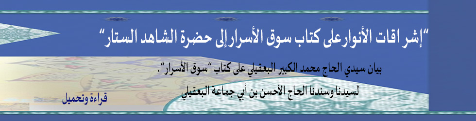 و لا يفوتنا في هذه المقدمة الترضي على روح سيدنا الحاج محمد الحبيب البعقيلي رضي الله عنه الذي خلف اباه لمدة تناهز النصف قرن و الذي لا تزال طلعته البهية تخالج ارواحنا و قلوبنا حضورا و مددا. و كذلك نخص بالذكر و الشكر شيخنا و استاذنا الحاج محمد الكبير البعقيلي رضي الله عنه الذي لا يزال يمدنا بما امده الله به من سر الطريقة و سر اسانيدها و يشع في ظلمات الاوهام بنوره الساطع الماحي لجميع الغفلات كالفيض الاقدس المطهر لغيره من كل ما سوى الله تبارك و تعالى. فالله يديم عزه و يؤيده بنصره و يطيل عمره مع تمام الصحة و العافية و يقر عينه بجميع من انتسب اليه من الاهل و الاولاد و التلاميذ الصادقين الاوفياء و كل من انحاش اليه.